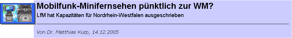 In Südkorea hat die Fernsehwelt via Mobilfunk bereits begonnen. Ein halbes Jahr nach dem Start im vergangenen Juni haben etwa 170.000 Handy-Kunden das neue Mini-Fernsehen abonniert. Nach Angaben des koreanischen Herstellers Samsung nutzen die Koreaner ihre Mobilfunkgeräte durchschnittlich pro Tag fast zwei Stunden lang als mobiles TV-Gerät und können etwa vierzig Programme empfangen. Für etwa zehn Euro pro Monat erhalten sie auf einem kleinen Handy-Display (2 Zoll, 240 mal 320 Bildpunkte) Kurznachrichten oder Ausschnitte aus Fernsehprogrammen in TV-Qualität. Möglich wird das dank des vor zehn Jahren ursprünglich in Deutschland entwickelten Standards DMB. Jetzt könnte die Technik, mit der die koreanischen Elektronikriesen Samsung und LG-Electronics in den kommenden fünf Jahren siebzig Prozent aller Mobilfunk-Endgeräte ausstatten wollen, in ihr europäisches Heimatland zurückkehren.