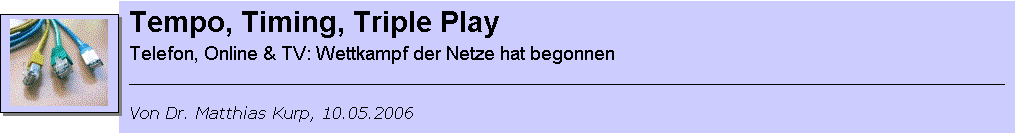 Die Vision des Triple Play klingt verlockend: Erst verschmelzen Fernsehgerät und Computer miteinander, dann auch ihre Netzanschlüsse. TV-Gerät und PC können auf diese Weise optimal zusammenarbeiten. Dringend erwartete E-Mails erscheinen während einer Fernsehsendung automatisch auf dem Bildschirm. Klassisches Free-TV und modernes Internet-Fernsehen (IP-TV) nutzen eine gemeinsame Plattform, bei der sich Zuschauer sogar während einer Sendung per Live-Chat über die Inhalte austauschen können. Fernsehfreaks durften diese Anwendung namens COSE (Communication Services on TV) bereits während der CeBIT am Siemens-Stand bestaunen. Was Triple-Play-Kunden aber am meisten freuen wird: Wer Telefonleitung, Internet-Zugang und TV-Kabelanschluss aus einer Hand bezieht, spart Geld und erhält obendrein eine günstige Online-Flatrate.