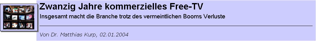 Alles in allem lagen die Einnahmen aller privatwirtschaftlichen TV-Programme – vom Vollprogramm bis zum Lokal-TV – im vergangenen Jahr etwa 800 Millionen Euro unter den Ausgaben, im Jahr 2001 betrug das Defizit sogar 1,3 Milliarden Euro. Die acht bundesweiten TV-Vollprogramme zusammen verbuchten 2002 ein Defizit von 34 Millionen Euro, bei den bundesweiten Spartenprogrammen lag der Verlust sogar bei insgesamt 131 Millionen Euro. Am stärksten aber trug das Pay TV (Premiere) zum Minus der TV-Branche bei: Bei einem Defizit von 563 Millionen Euro konnten nur 61 Prozent der Kosten gedeckt werden.