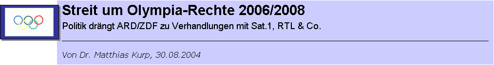 ZDF-Intendant Markus Schächter erklärte am 20. August im Rahmen eines Besuches in Athen, er sei durchaus bereit, erworbene Olympia-Rechte „teilweise an Privatsender weiterzugeben“. Über ihre Mitgliedschaft bei der Europäische Rundfunk-Union (EBU) konnten sich ARD und ZDF zwar im Juni die Fernsehrechte an den Olympischen Spielen bis 2012 sichern (4 siehe Artikel Olympisches Tauziehen um TV-Rechte und Öffentlich-rechtlicher Olympia-Sieg), mussten sich aber verpflichten, gegebenenfalls Sublizenzen an andere TV-Programmanbieter zu vergeben. Andernfalls hätten die Wettbewerbshüter der EU-Kommission den Vertrag zwischen der EBU und dem Internationalen Olympischen Komitee (IOC) als Einkaufskartell verbieten müssen.
