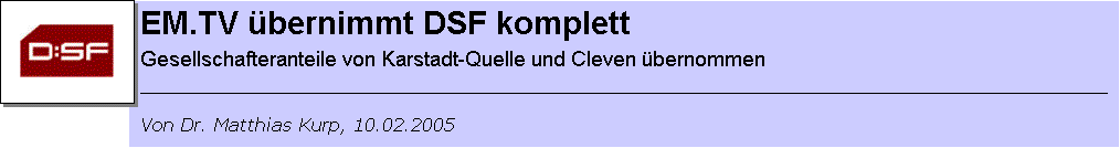 Das Deutsche SportFernsehen (DSF) wird komplett von der Medienfirma EM.TV übernommen, die mit ursprünglich etwa 39 Prozent bereits seit 2003 zu den DSF-Gesellschaftern gehört. In der vergangenen Woche hatte Karstadt-Quelle seine DSF-Anteile (40 Prozent) an die EM.TV AG verkauft. Die restlichen 19 Prozent von DSF gehören dem Schweizer Finanzinvestor Hans-Dieter Cleven und sollen nun ebenfalls an EM.TV verkauft werden. Das jedenfalls teilte die Aktiengesellschaft am 10. Februar mit.