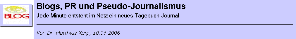 Generell aber herrscht zwischen der von subjektiven Empfindungen geprägten Blogger-Welt und dem Journalismus ein eigenartiges Spannungsverhältnis. Der Dortmunder Journalistik-Professor Marcel Machill warnt bereits vor „Pseudo-Journalismus“, weil viele Blogger inzwischen mit dem Gestus und Geltungsanspruch etablierter Massenmedien auftreten. Objektivität oder gar Qualitätskontrolle spielen in den Online-Tagebüchern – abgesehen von den Vorzeigeprojekten einiger etablierter Journalisten – keine Rolle. Statt Fakten werden häufig Meinungen präsentiert, an die Stelle von Recherchen treten dann Vorurteile.