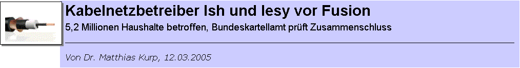 Genehmigt das Kartellamt im Sommer die Übernahme von Ish durch Iesy, wächst der Verbund mit 5,2 Millionen angeschlossenen Haushalten zum zweitgrößten Kabelnetz hinter der Kabel Deutschland GmbH (KDG), die knapp zehn Millionen Haushalte versorgt. Zurzeit ist Ish mit seinen knapp 4,1 Millionen Kunden in Nordrhein-Westfalen der fünftgrößte europäische Kabelnetzbetreiber. 1,3 der Ish-Haushalte wurden bereits so digitalisiert, dass ein „Triple Play“ inklusive Telefonie und Online-Zugang über das Kabelfernsehnetz möglich ist. Auch bei Iesy gibt es längst Online-Zugänge, vor allem im Frankfurter Raum. Ob diese Wettbewerbsimpulse reichen, um die weitere Konzentration im Bereich der TV-Kabelnetze zu kompensieren, dürfte bei der Entscheidung des Bundeskartellamtes eine zentrale Rolle spielen.