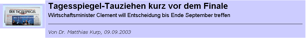 Bereits zum zweiten Mal hatte Clement alle Beteiligten am 8. September zu einer Anhörung eingeladen. Im Hörsaal des Berliner Bundeswirtschaftsministeriums erschienen außer den Verlegern Stephan von Holtzbrinck und Heinz Bauer, die mit ihren Anwälten angereist waren, auch Vertreter des Axel Springer Verlages, der Frankfurter Allgemeinen Zeitung und der Märkischen Oder-Zeitung. Mehrere Stunden lang wurde dabei über den Berliner Zeitungsmarkt, über Pressekonzentration und mögliche Zukunftsperspektiven diskutiert. Nachdem die Berliner Zeitung im Juli 2002 vom Verlag Gruner + Jahr (zusammen mit dem Boulevardblatt Berliner Kurier) an Holtzbrinck verkauft worden war, hatten sowohl das Bundeskartellamt als auch die Monopolkommission diese Übernahme mit folgender Begründung abgelehnt: Da Holtzbrinck in Berlin auch den Tagesspiegel herausgebe, erlange der Verlag in der Hauptstadt nach dem Kauf der Berliner Zeitung mit einem Abonnement-Marktanteil von 61,4 Prozent zu viel Marktmacht, die eine Wachstumsbarriere für andere Unternehmen darstelle (4 siehe Artikel Hängepartie im Streit um Berliner Zeitung).