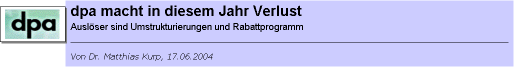 „Die Planungen für 2004 sehen zwar bei der Muttergesellschaft ein negatives Betriebsergebnis vor. Bis spätestens 2006 wollen wir aber wieder eine ausgeglichene Bilanz erreichen“, teilte Walter Richtberg, seit 1985 Vorsitzender der dpa-Geschäftsführung, mit. Sein Sparprogramm sieht vor allem Stellenabbau vor. 2001 hatte dpa noch mehr als 900 Angestellte. Bis Ende 2006 soll die Zahl der Planstellen von zurzeit etwas mehr als 800 „auf unter 700 fallen“, kündigte Richtberg an. Im vergangenen Jahr wurden deshalb 55 Stellen gestrichen. Die Einsparungen im redaktionellen Bereich sollen aber, so versprach Chefredakteur Wilm Herlyn, so konzipiert sein, dass die Qualität der Texte nicht in Frage gestellt sei. Zwar soll an der Berichterstattungstiefe nicht gespart werden, so wurde bei des Pressekonferenz in Hamburg deutlich, aber bei der Themenbreite sind Abstriche wahrscheinlich. Betroffen könnte davon etwa der Umfang der Landesdienste sein.