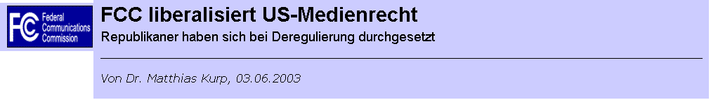 „Mit den neuen Regeln wäre es mir unmöglich gewesen, CNN ins Leben zu rufen, kritisierte Ted Turner die neuen FCC-Regeln, die den Wettbewerb und die Meinungsfreiheit gefährden würden. Zu den Kritikern der neuen Deregulierung zählt außer Turner auch der New-York-Times-Kolumnist William Safire, der den Medienkonzernen einen „Griff nach der Macht“ vorwarf. Geltung erhalten die neuen Bestimmungen zwar erst, wenn auch der US-Kongress grünes Licht für die Liberalisierung gibt. Davon ist aber angesichts der Mehrheit der Republikaner auszugehen.
