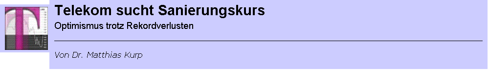 Im vergangenen Jahr machte die Deutsche Telekom AG 24,6 Milliarden Euro Verlust (2001: minus 3,5 Mrd. Euro) – mehr als jedes andere deutsche Unternehmen zuvor! Trotz dieses Rekorddefizit sehen die meisten Analysten die Zukunft der Telekom wieder ein wenig mehr rosarot. Schließlich, so heißt es, resultiere das Minus für das vergangene Geschäftsjahr vor allem aus Wertberichtigungen auf die teuren UMTS-Mobilfunklizenzen und auf Unternehmenswerte in Höhe von 9,3 Milliarden Euro. Rickes Zauberformel heißt nun „6 plus 6“: Jeweils 6 Milliarden Mark sollen durch den Verkauf von Vermögensteilen und das operative Geschäft in die Kasse kommen. Weil der größte Teil der Verbindlichkeiten aus Anleihen besteht, betrug die Kreditsumme bei Banken für die Telekom zum Jahresende nur noch 6,3 Milliarden Euro.