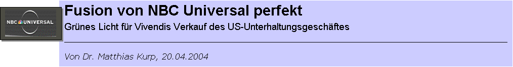 Die Federal Trade Commission (FTC) in Washington gab grünes Licht für die Bildung eines weiteren Global Players der Medienbranche, der sich außer in Amerika und Europa nun auch in Asien engagieren will. Keimzelle des Unternehmens ist das US-Network NBC als eine Tochtergesellschaft des US-Elektronikkonzerns General Electric. Dieses Unternehmen zahlt den Aktionären von Vivendi Universal Entertainment (VUE) für die Übernahme ihres Unternehmens 3,8 Milliarden Dollar in bar, wovon 3,4 Milliarden Dollar direkt an Vivendi fließen. Außerdem sollen Schulden in Höhe von etwa 1,7 Milliarden Dollar übernommen werden.