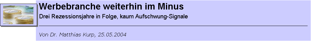 Wachstum konnten im vergangenen Jahr nur die Branchen Anzeigenblätter (+2,6 Prozent), Kino (+0,1 Prozent) und vor allem die Online-Medien verzeichnen, deren Netto-Werbeumsätze im Vergleich zu 2002 um 8,4 Prozent auf 246 Millionen Euro stiegen, allerdings am Gesamtwerbevolumen lediglich knapp 1,3 Prozent ausmachten. Ähnlich stark wie die Tageszeitungen wurden auch die Fachzeitschriften von der Werbekrise getroffen. In diesem Marktsegment gingen die Einnahmen 2003 im Vergleich zum Vorjahr um 8,9 Prozent zurück und erreichten nur noch knapp 70 Prozent des Niveaus aus dem Jahr 2000.
